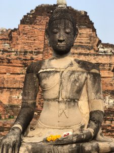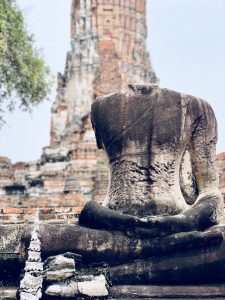Ayutthaya vaut le détour. Non pas la ville en elle-même mais ses ruines. Je suis sous le charme des temples anciens. Des vieilles pierres chargées d’histoire. Un premier arrêt sur image et ce n’est pas un uppercut au menton que je viens de recevoir. Une profonde inspiration sort de ce lieu hors du temps, fondé sur une île, et m’enveloppe.